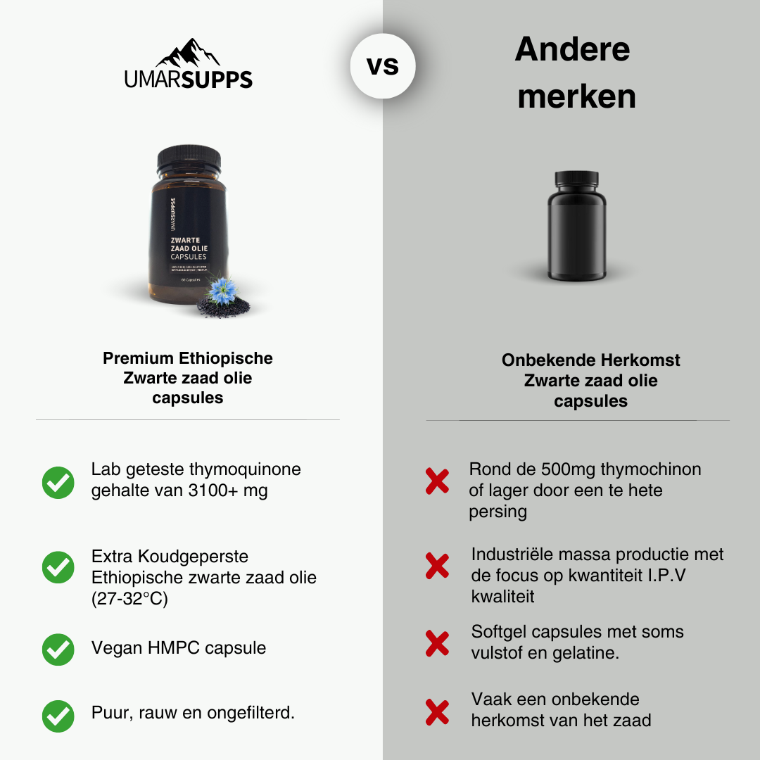 Deze premium capsules zijn gevuld met 100% Pure Ethiopische zwarte zaad olie. De olie wordt extra koudgeperst op slechts 29–32°C zo dat alle belangrijke stoffen in het zwarte zaad heel en zuiver blijven.